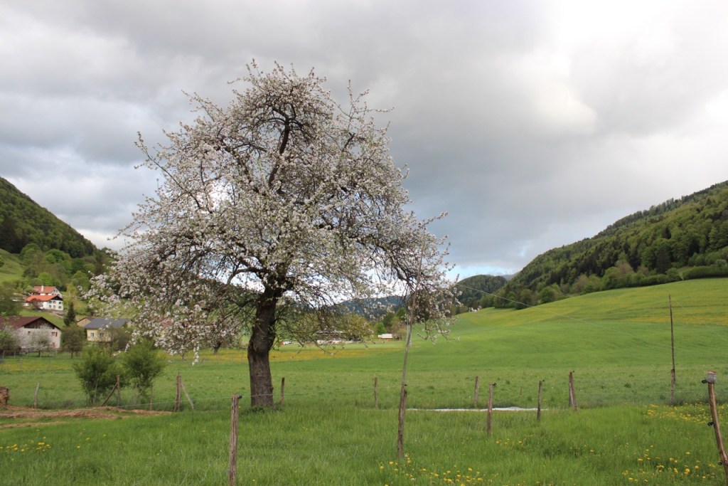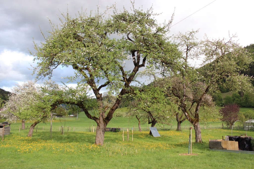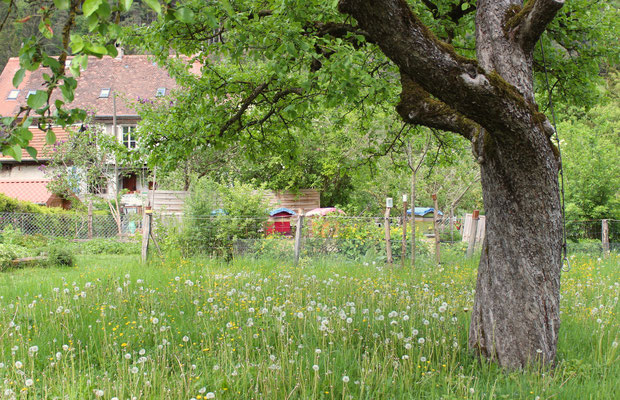 Seit 2001 pflegen wir in Undervelier im Schweizerischen Jura einen Obsthain mit 9 Hochstammobstbäumen. Seit 2012 haben wir 13 neue Bäume verschiedener Sorten angepflanzt, um die alten Bäume auf lange Sicht zu ersetzen. Die Bäume werden jeden Winter geschnitten. Im Herbst werden die Früchte von Hand geerntet, ein Teil wird für den Winter eingelagert