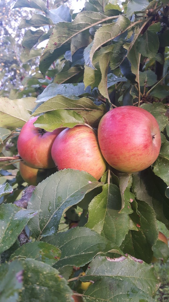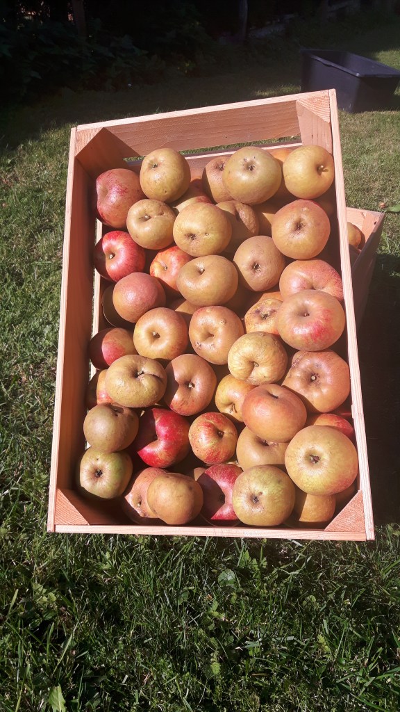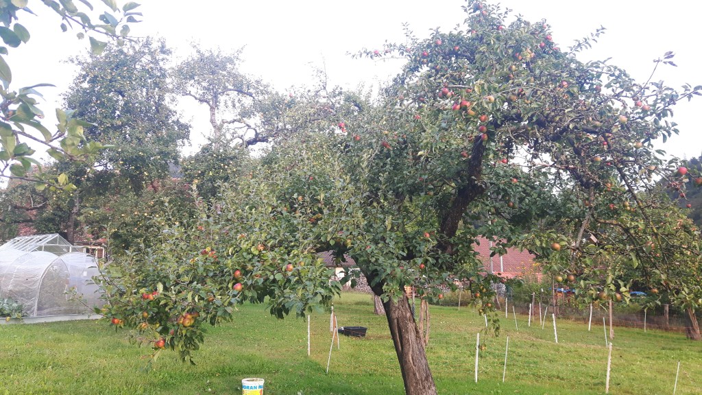 Die Menge der geernteten Früchte schwankt stark, in manchen Jahren können wir gerade mal 2 Apfelkuchen backen und im anderen können wir bis zu 1000 Liter Most pressen.